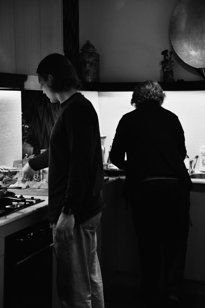 Jack has just finished having a shower and Ronda is busy roasting vegetables.